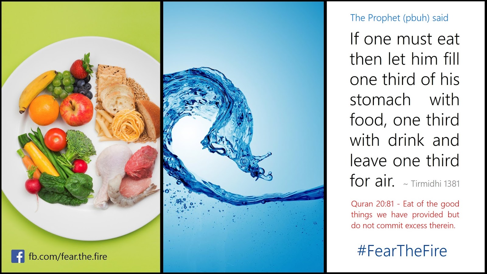 The Prophet (pbuh) said: “The son of Adam does not fill any vessel worse than his stomach; for the son of Adam a few mouthfuls are sufficient to keep his back straight. If you must fill it, then one-third for food, one-third for drink and one-third for air.” ~ Ibn Majah, 4/29/3349