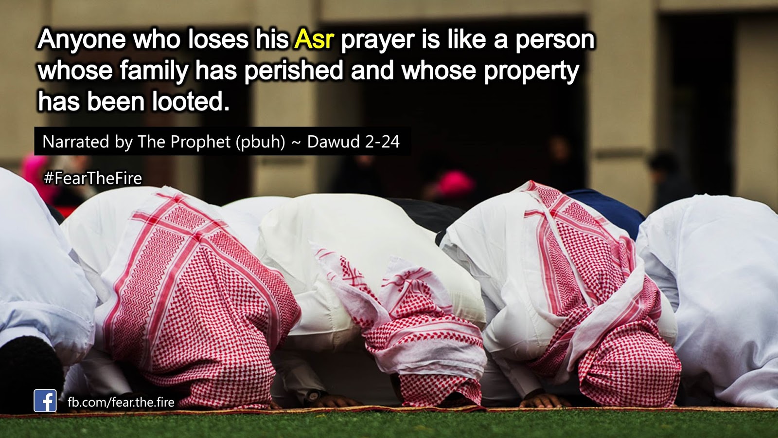 The Prophet (pbuh) said: “Anyone who loses his ‘Asr’ prayer is like a person whose family has perished and whose property has been looted.” ~ Abu Dawud 2/24