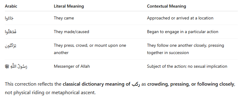 (𝟑) 𝐂𝐡𝐚𝐫𝐚𝐜𝐭𝐞𝐫𝐢𝐬𝐚𝐭𝐢𝐨𝐧 𝐨𝐟 𝐭𝐡𝐞 𝐩𝐡𝐲𝐬𝐢𝐜𝐚𝐥 𝐜𝐨𝐧𝐭𝐚𝐜𝐭 𝐝𝐞𝐬𝐜𝐫𝐢𝐛𝐞𝐝 𝐢𝐧 𝐭𝐡𝐞 𝐧𝐚𝐫𝐫𝐚𝐭𝐢𝐨𝐧𝐬 𝐚𝐬 𝐫𝐞𝐩𝐞𝐚𝐭𝐞𝐝 𝐬𝐞𝐱𝐮𝐚𝐥 𝐚𝐜𝐭𝐬 𝐩𝐞𝐫𝐟𝐨𝐫𝐦𝐞𝐝 𝐨𝐧 𝐭𝐡𝐞 𝐏𝐫𝐨𝐩𝐡𝐞𝐭 (𝐌𝐮𝐬𝐧𝐚𝐝 𝐀𝐡̣𝐦𝐚𝐝 𝟔/𝟑𝟑𝟐‑𝟑𝟑𝟒 𝐰𝐨𝐫𝐝𝐢𝐧𝐠: “فَأَتَوْا، فَجَعَلُوا يَرْكَبُونَ رَسُولَ اللهِ”).