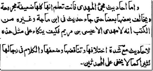 “And as to Ahadith about the arrival of Mahdi you know they are all Da’if and problematic contradicting one another so much so that in one narration in Ibn Majah and other books says, ‘There is no Mahdi except ‘Eisa, so how can one rest is his case on such kind of narrations with so much difference and contradictions, weakness and criticism on their narrators, as is not hidden from the scholars of Hadith?”
