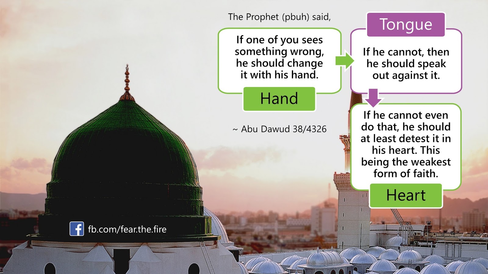 If one of you sees something wrong, he should change it with his hand. If he cannot, then he should speak out against it. If he cannot even do that, he should at least detest it in his heart. This being the weakest form of faith. ~ Abu Dawud 38/4326