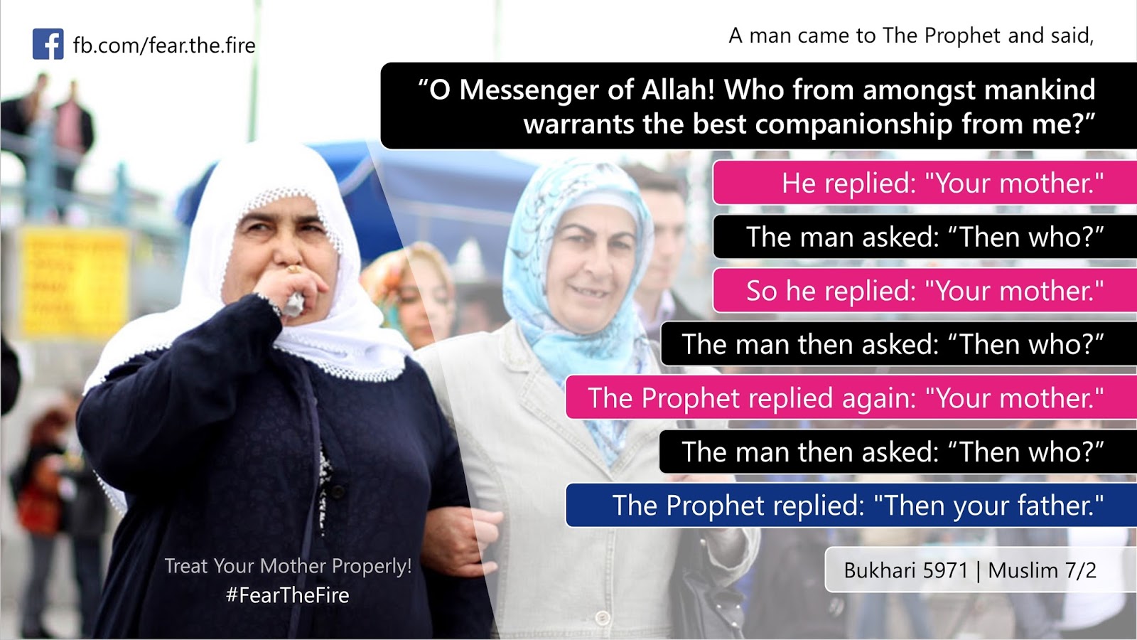 O Messenger of Allah! Who from amongst mankind warrants the best companionship from me?” The Prophet (pbuh) said, “Your mother.” The man asked, “Then who?” He (pbuh) replied, “Your mother.” The man then asked “Then who?” The Prophet (pbuh) replied again, “Your mother.” The man asked, “Then who?” The Prophet (pbuh) replied, “Then your father.” ~ Bukhari 5971 | Muslim 7/2