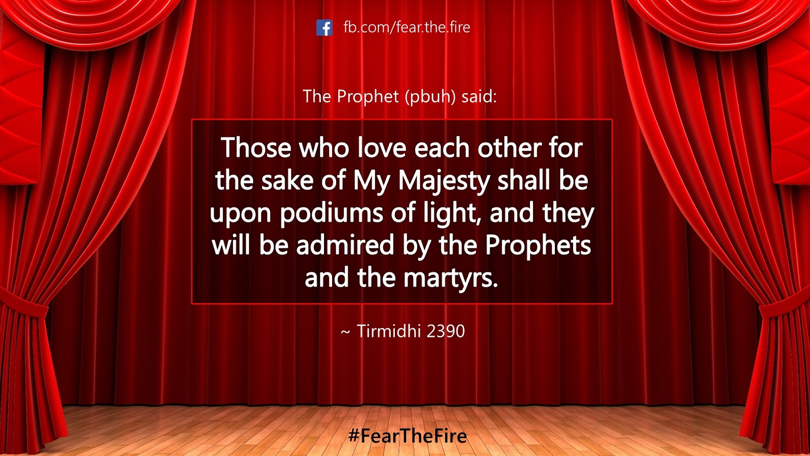 ‘Allah, the Mighty and Magnificent says: ‘Those who have mutual love for the sake of My Glory will have pillars of light and will be envied the Prophets and martyrs.’ Tirmidhi 2390 | Musnad Ahmad 5/336-7